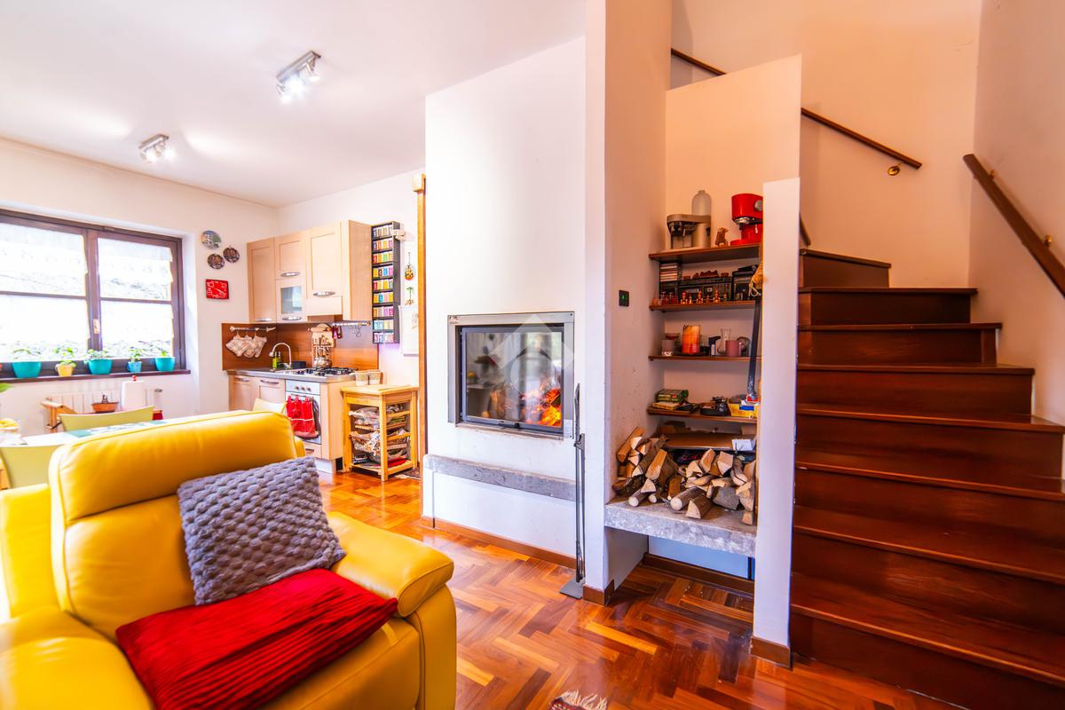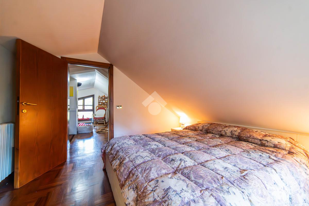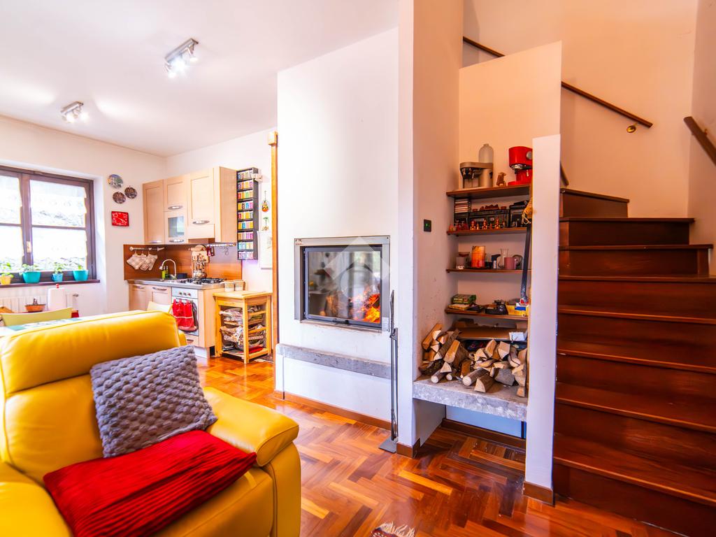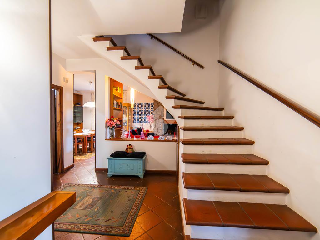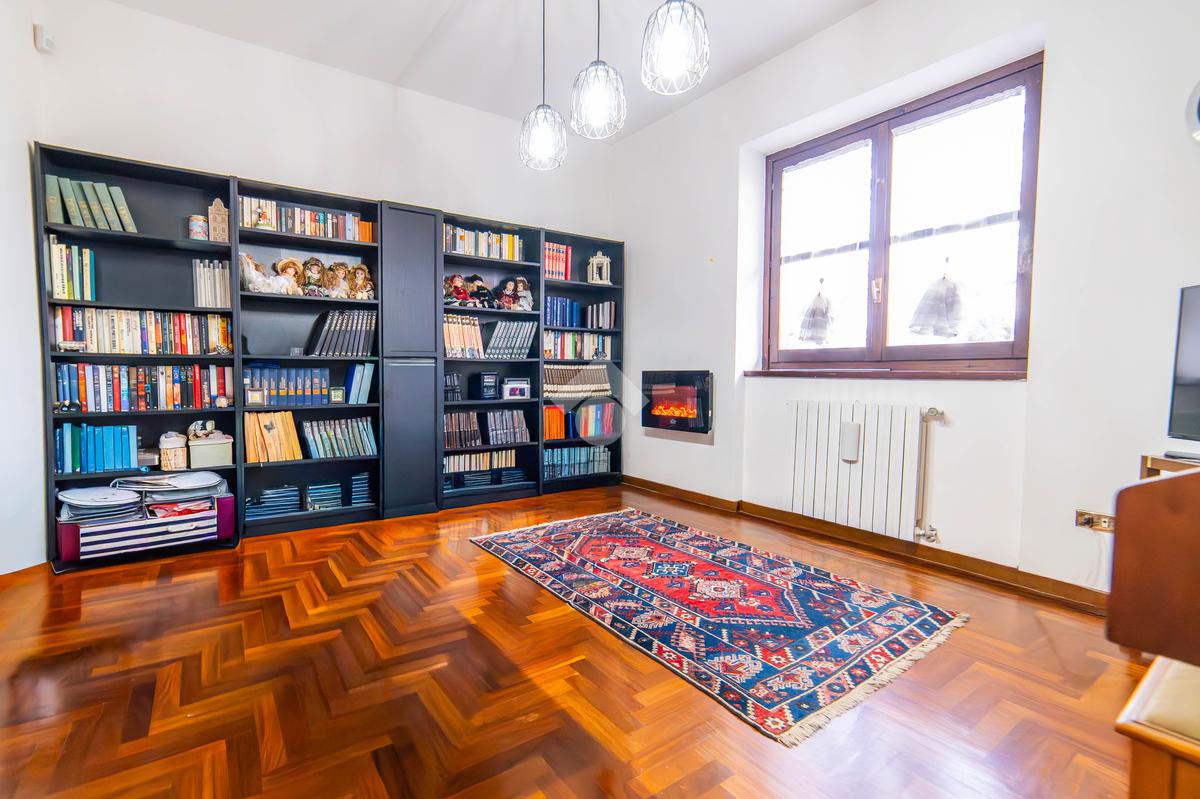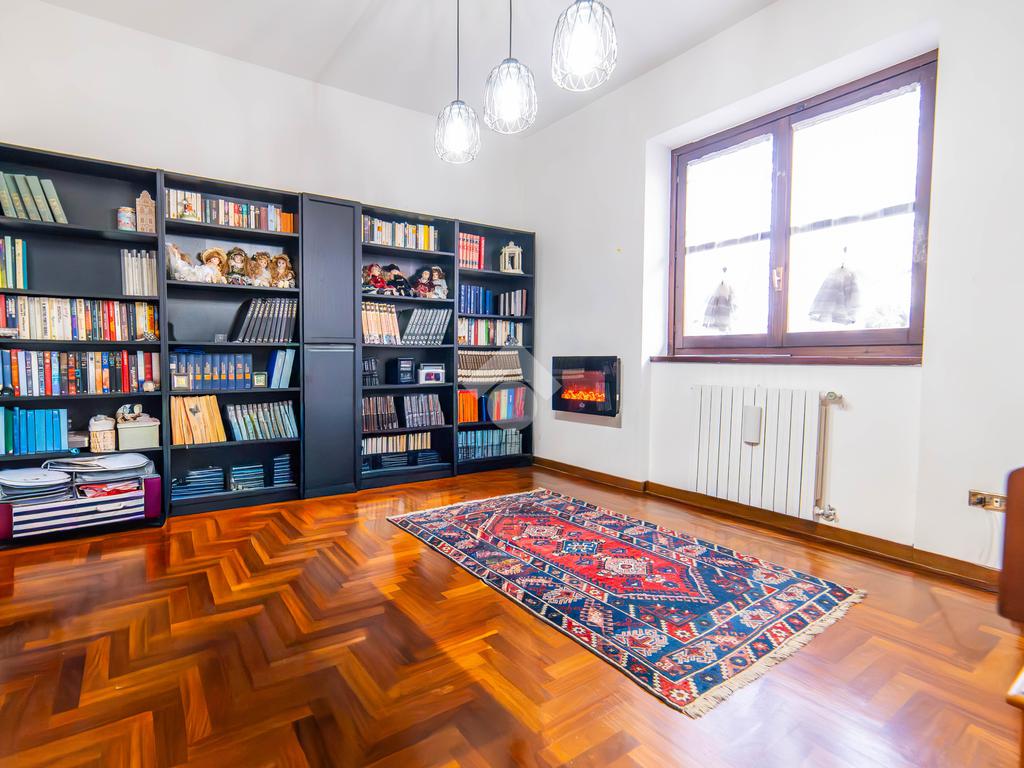 Il piano primo, rifinito in parquet, ospita una seconda zona giorno con cucina e soggiornino arricchito da termocamino Vulcano, con accesso a una terrazza di circa 20 mq dotata di pratico montacarichi per la legna. La zona notte comprende due camere da letto, di cui una con bagno privato, un ulteriore bagno, uno studio e una comoda lavanderia dove si trova la caldaia di recente installazione.
