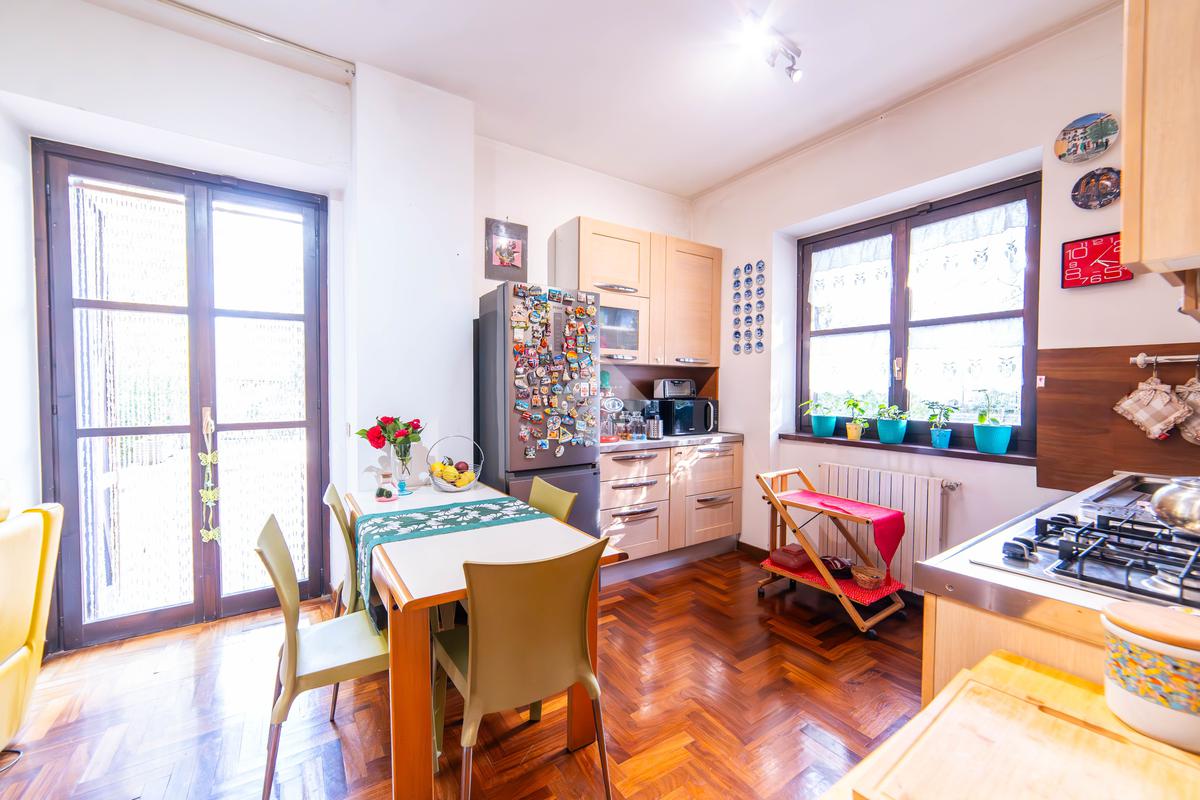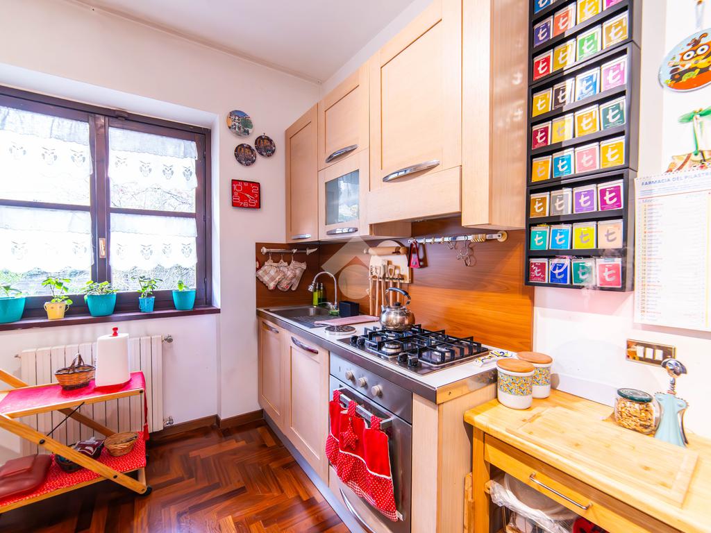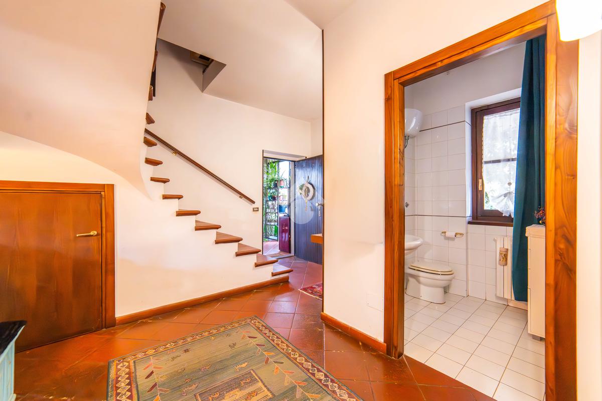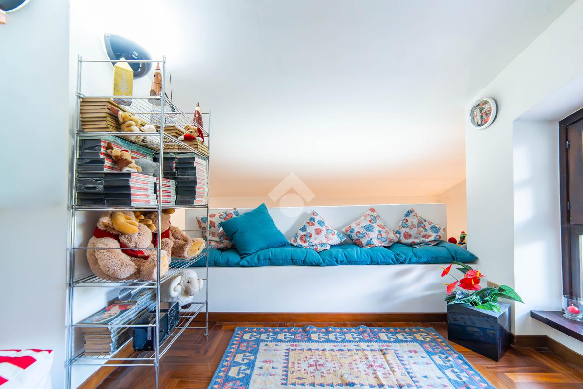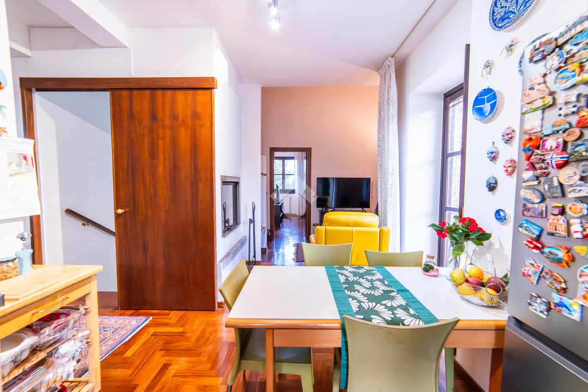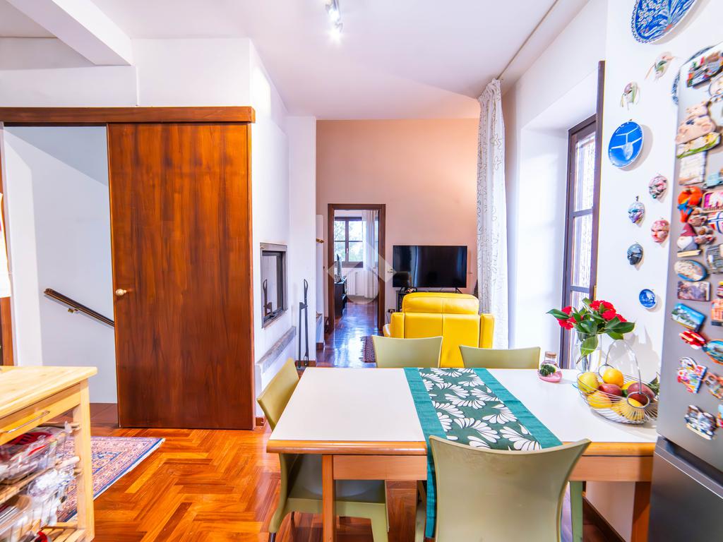 Il piano primo, rifinito in parquet, ospita una seconda zona giorno con cucina e soggiornino arricchito da termocamino Vulcano, con accesso a una terrazza di circa 20 mq dotata di pratico montacarichi per la legna. La zona notte comprende due camere da letto, di cui una con bagno privato, un ulteriore bagno, uno studio e una comoda lavanderia dove si trova la caldaia di recente installazione.