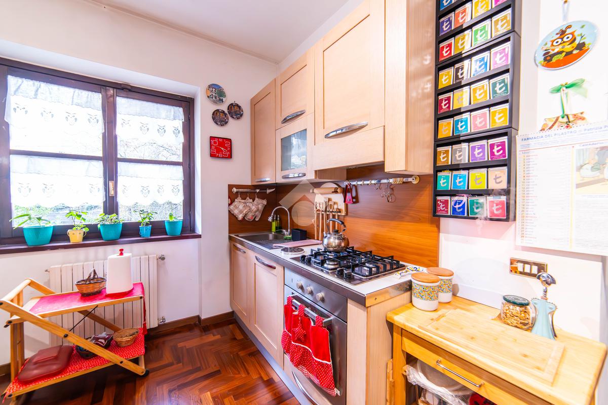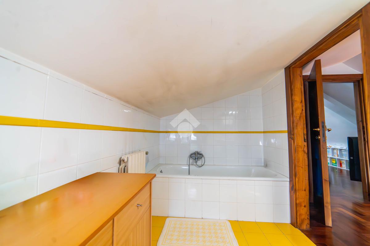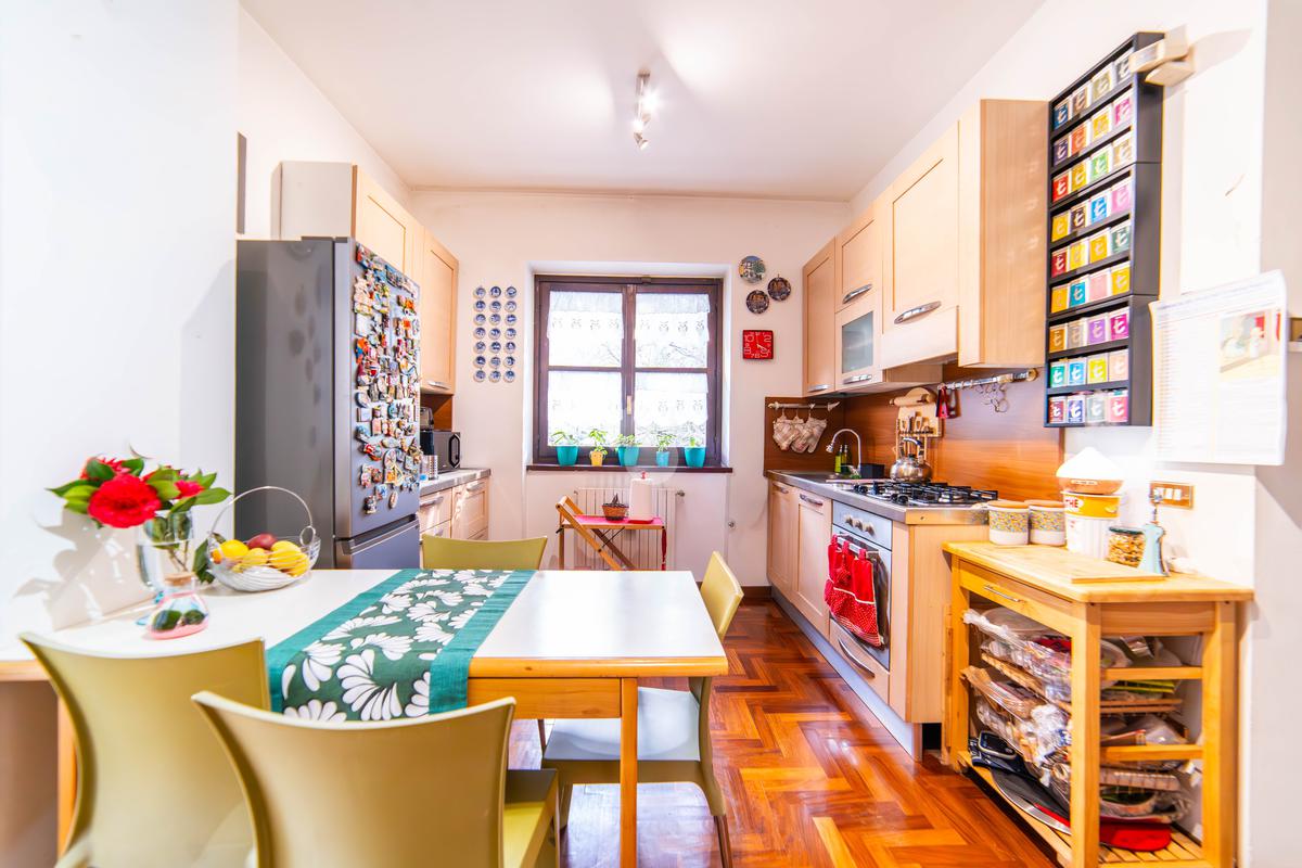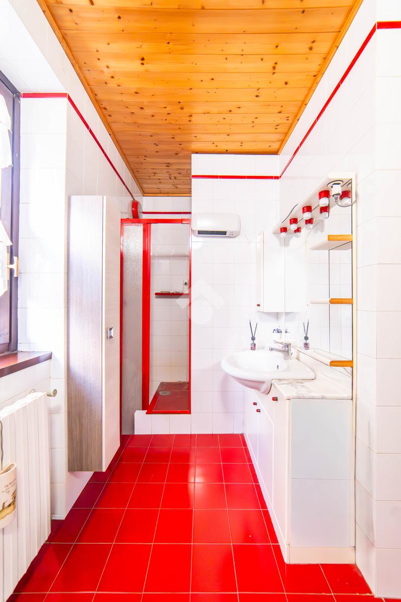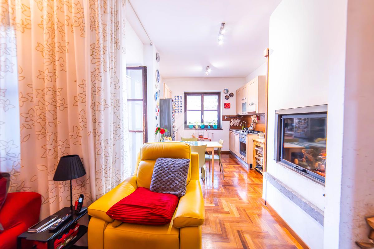 Il piano primo, rifinito in parquet, ospita una seconda zona giorno con cucina e soggiornino arricchito da termocamino Vulcano, con accesso a una terrazza di circa 20 mq dotata di pratico montacarichi per la legna. La zona notte comprende due camere da letto, di cui una con bagno privato, un ulteriore bagno, uno studio e una comoda lavanderia dove si trova la caldaia di recente installazione.