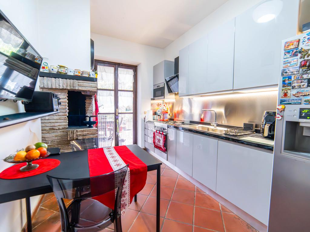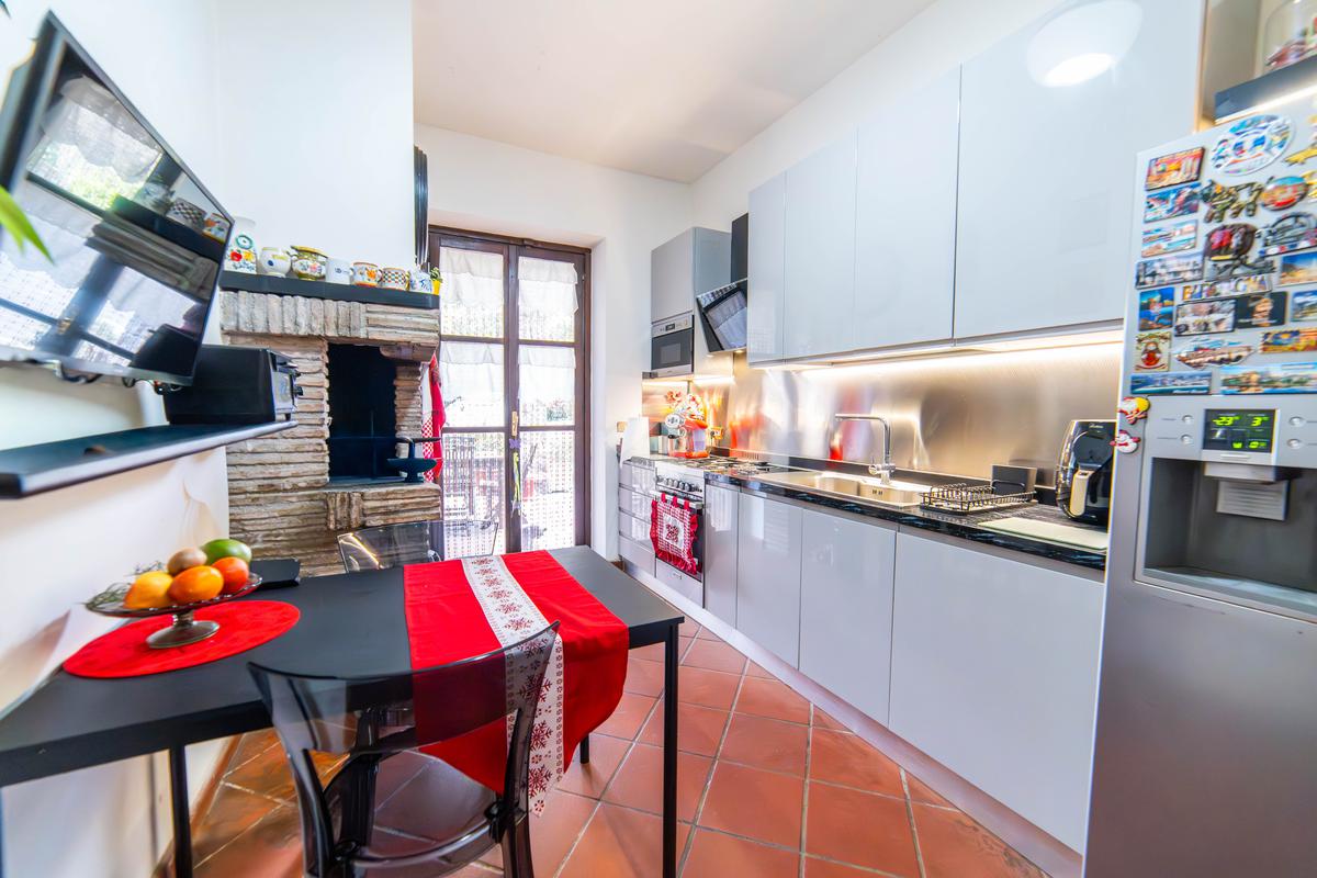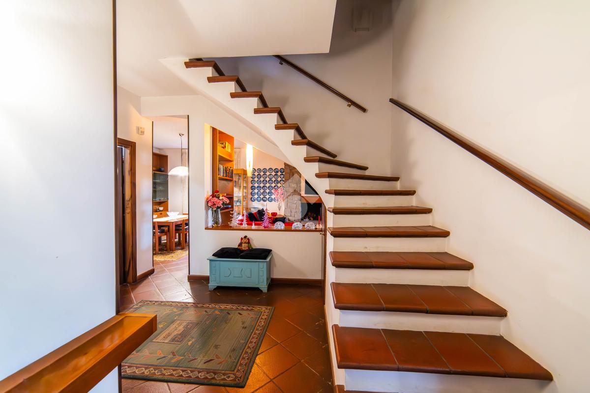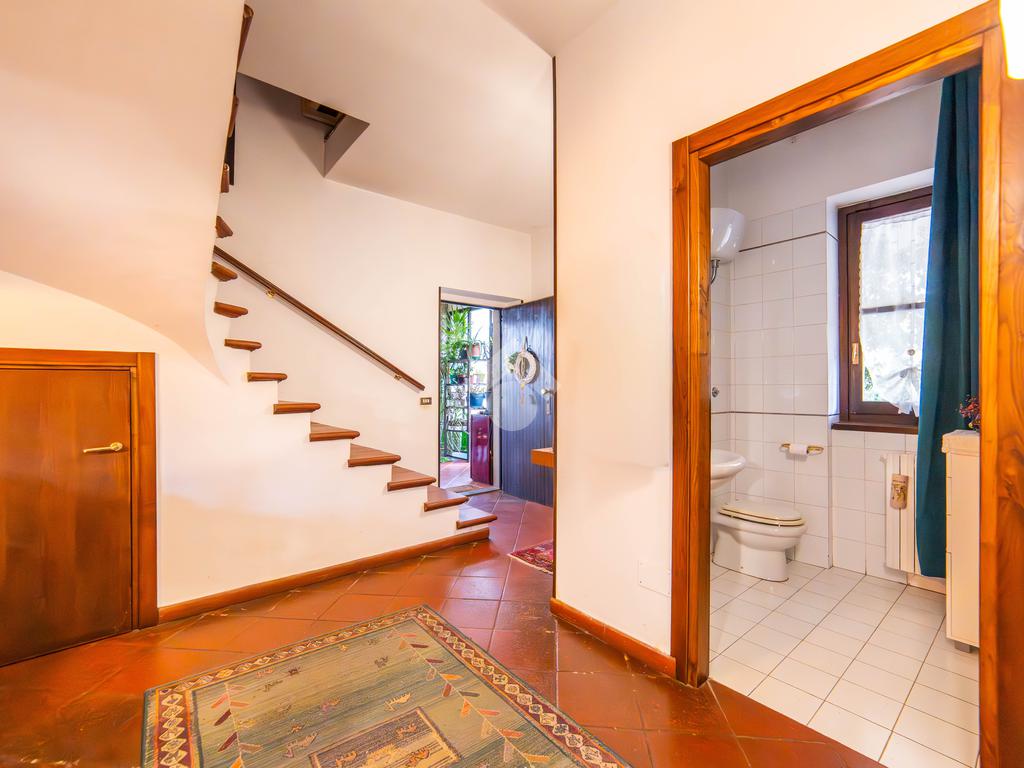Al piano terra si viene accolti da un ingresso vetrato con stufa a pellet, che introduce alla zona giorno composta da una cucina abitabile con camino e accesso diretto al portico esterno, perfetto per pranzi e momenti di relax all’aperto. Completa il piano un doppio salone molto luminoso, anch’esso dotato di stufa a pellet e camino, oltre a un bagno finestrato. La pavimentazione in cotto contribuisce a creare un’atmosfera calda e accogliente.